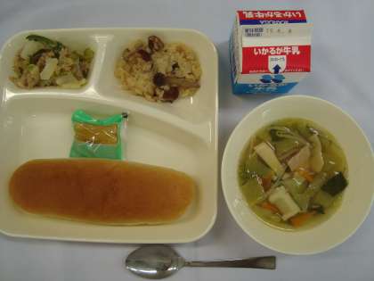 「金時豆の中華おこわ、中華スープ、ツナと野菜のオイスターソースいため、コッペパン、りんごジャム、牛乳」