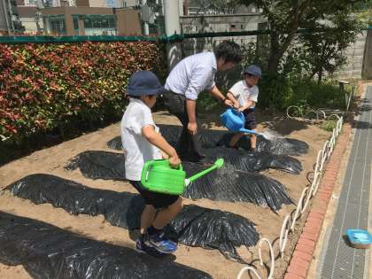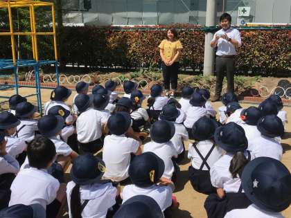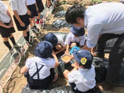 和田萬商店の方に来て頂き、学習園で金ゴマの種まきを行いました。最初に、上手な種まきのコツを教えてもらいました。深さは1〜2cmくらいがちょうどいいそうなので子ども達は自分の指の爪を目安にして丁寧に種を植えていました。収穫は9月ごろで、その時には2m近い高さまで育っているとの事です。今から楽しみです!