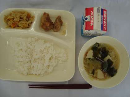 「鶏肉のしょうゆバター焼き、五目汁、切り干しだいこんのいため煮、ごはん、牛乳」