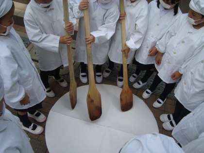 実際に調理員の皆さんが使用されている道具を持たせてもらい、大きな窯の中をまぜる体験をしました。「大きいね。」「むずかしいね。」といった声があがっていました。