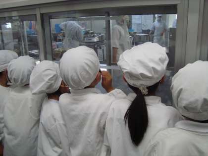 次に、いつも食缶を受け取る場所から、調理室の中を見学しました。大きな窯がいくつもあって、ぐつぐつ煮えている様子や、それをかきまぜる様子など、調理の様子をじっくり見ることができました。「今日はスパゲッティーかな。」と、給食を楽しみにしている声が聞こえてきました。