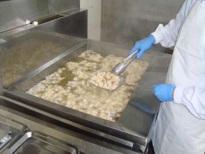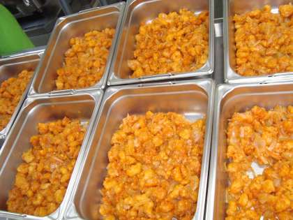 えびのチリソースは、下味をつけたえびにでんぷんをまぶし、油で揚げ、しょうが、にんにく、たまねぎ、トウバンジャン、砂糖、こい口しょうゆ、ケチャップでつくったソースにからめています。