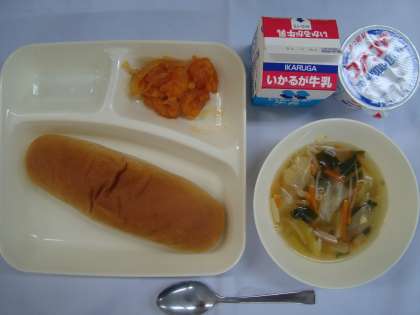 「えびのチリソース、中華スープ、ヨーグルト、黒糖パン、牛乳」
