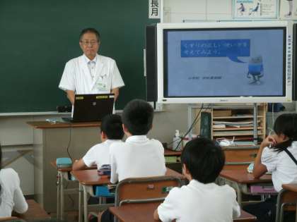 学校薬剤師の米山先生に来て頂いて、薬についての勉強をしました。「なぜ、薬を飲むのか?」から始まって、簡単な実験を交えながら、薬の正しい飲み方を教えて頂きました。