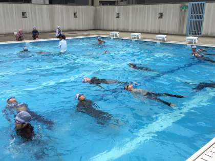 3年生〜6年生は、着衣泳を行いました。衣服を着た状態で海や川に落ちると上手に泳ぐことはできません。着衣泳では、上手く泳ぐ練習ではなく、呼吸を確保した上で、救助されるまで慌てずに浮いて待つことの対処法を学習しました。また、ペットボトルを使って、救助する方法を学習しました。