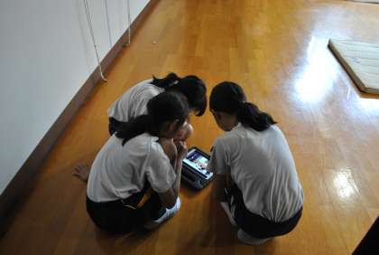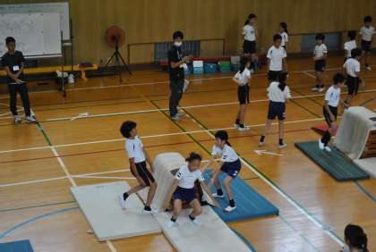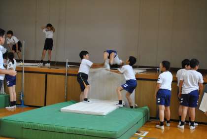 本校では、「主体的・対話的で深い学び」の視点に立った授業改善をテーマに全教員、全学級で研究授業を実施しています。第1回目は、5年生の体育科で「首跳ねとび」の授業を実施しました。運動者に必ず補助者をつけ、アドバイスし合うことで仲間と共に問題を見出して解決策を考え、動きの質を高められることができました。