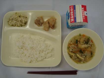 「鶏肉のしょうゆマヨネーズ焼き、五目汁、切り干しだいこんのゆずの香あえ、ごはん、牛乳」