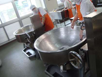 給食室では、給食を作り終えた午後からはエプロンをかえて洗浄作業に入ります。児童・生徒の食器が返ってくるまでは、機械器具を洗います。(釜を洗っています。)