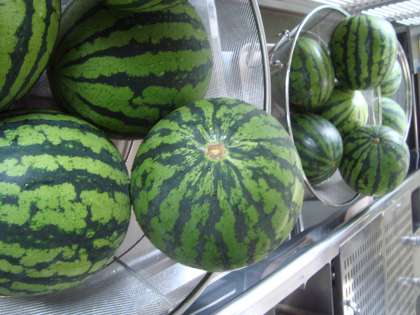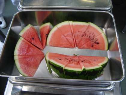 給食では、年に一度すいかが登場します。給食室で1/64こに切っています。1枚目の写真のすいかは、西天満小学校と天満中学校の2校分です。