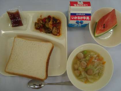 「鶏肉と夏野菜のソテー、押麦のスープ、すいか、食パン、いちごジャム、牛乳」