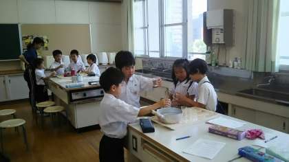 水のかさの単位の学習で、実際に容器に水を入れて確かめるために家庭科室へ行きました。水筒、やかん、急須、鍋・・・1dLますのいくつ分の水が入るのか、班で協力して調べました。最後に、「10dL=1L」を確かめるために、リットルますにデシリットルマスで水を入れていきました。ちょうど10杯分だとわかり、「ほんまや!」と驚く子もいました。
