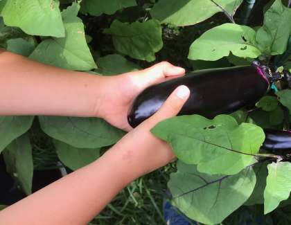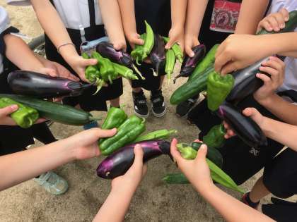 学年で育てている学習園の野菜が収穫の時期を迎えました。キュウリ、ナス、ピーマン、オクラの4つの野菜です。すでに何度か収穫したのですが次々と実がなってきます。子ども達の毎日の水やりの成果ですね!