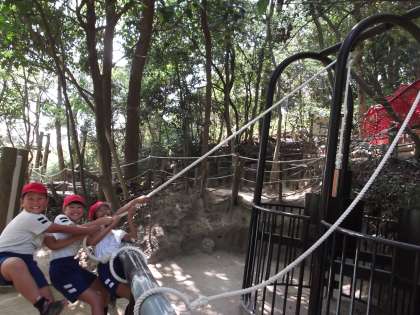 網の張り巡らされた道を登ったり、ターザンのようにひもにぶら下がったり、