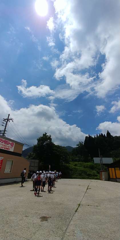 バスの中では雨にも降られ、心配していたお天気ですが、バスを降りると、なんとびっくり、真っ青な夏空が広がっていました。誰一人車酔いすることもなく、全員元気に到着しました。