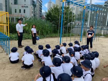 和田萬商店の方に来て頂き、学習園で金ゴマの収穫を行いました。6月に植えたゴマの種が3ヶ月で驚く程成長しました。大きいもので何と2m40cmもの高さに!余分な葉をとってきれいに実だけを残しました。