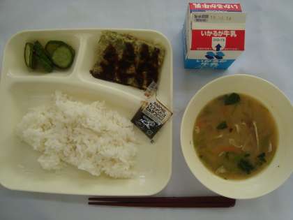 「お好み焼き、豚汁、きゅうりの甘酢あえ、ごはん、牛乳、トンカツソース」