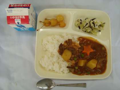 今日のハヤシライスは、小麦粉を使っていないハヤシライスです。ラッキー人参(星形.ハート型)がクラスに3個程度入っています。2枚目の写真は、給食室前に掲示してある給食見本です。給食当番は、給食見本を見て盛りつけます。