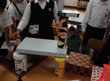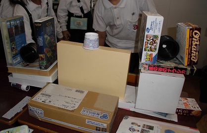 ポイントは、作りたいものに合わせて、箱を選んだり置き方を考えたりすること。「どれを使ったら高くなるかな。」「丸い缶はタイヤにぴったり。でも、ころがってしまうよ。」グループで意見を出し合って楽しく、作品を完成させました。