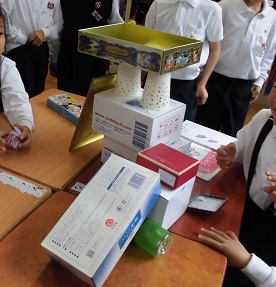 算数科「かたちあそび」の学習で、持ち寄った箱を組み合わせて、作りたいものを決めて、乗り物や動物、建物など、いろいろなものを作りました。