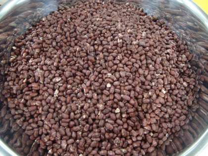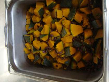 いとこ煮とは、小豆などを煮た煮物料理で、各地に伝わる郷土料理の一つです。給食では、小豆(写真上)とかぼちゃを使っています。