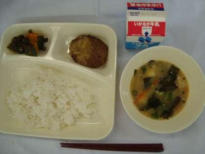 「和風おろしハンバーグ、みそ汁、かぼちゃのいとこ煮、ごはん、牛乳」