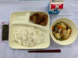 「みそカツ、じゃがいもと野菜の煮もの、焼きのり、ごはん、牛乳」