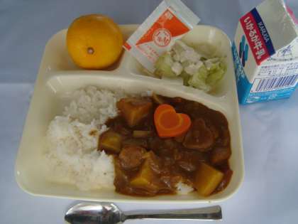 「ポークカレーライス(米粉)、キャベツのサラダ(ノンエッグドレッシング)、みかん、牛乳」
