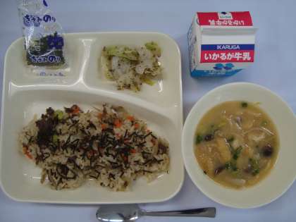 「牛肉のきんぴらちらし、みそ汁、キャベツの赤じそあえ、きざみのり、牛乳」