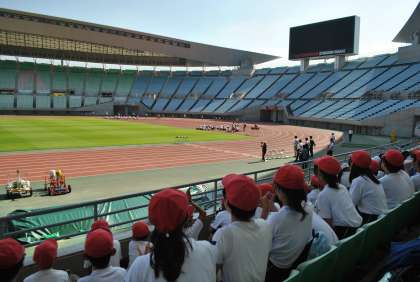 午前中は、陸上競技でした。100m走、800m走、学校対抗4×100mリレーがありました。広い陸上競技場で思い切り走ることができ、子どもたちは貴重な体験をすることができました。