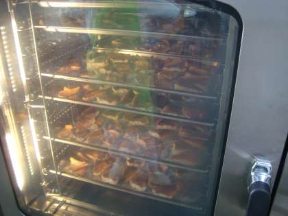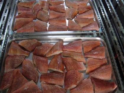 赤魚は、塩で下味をつけた後、焼き物機(オーブン)で焼き、みりん、料理酒、しょうゆを合わせたタレをかけて作ります。