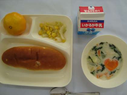 「ほたて貝のクリームシチュー、キャベツとコーンのサラダ、みかん、おさつパン、牛乳」