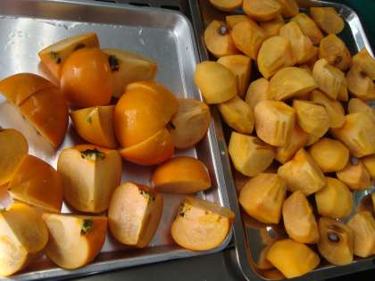 今日のかきは、富有柿という品種です。食べやすく皮をむいています。