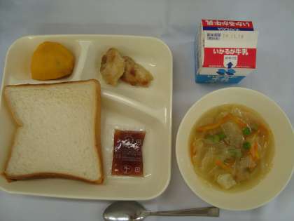「鶏肉のガーリックマヨネーズ焼き、スープ、かき、食パン、牛乳、いちごジャム」