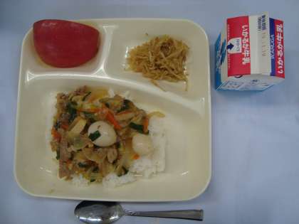 中華丼は、うずら卵の個別対応給食です。アレルギーでうずら卵を食べられない児童にうずら卵が入っていない中華丼を提供しています。りんごは、1年生から3年生までは食べやすいように皮をむいています。