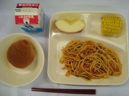 「きのこのスパゲッティ、焼きとうもろこし、りんご、黒糖ロールパン、牛乳」