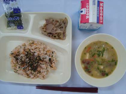 「さけとこまつなのごはん、豚肉とれんこんの甘辛焼き、冬野菜のみそ汁、ごはん、牛乳」