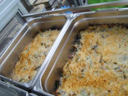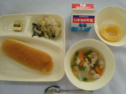 「スープ煮、ほうれん草のグラタン、白桃(かんづめ)、コッペパン、バター、牛乳」