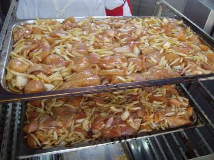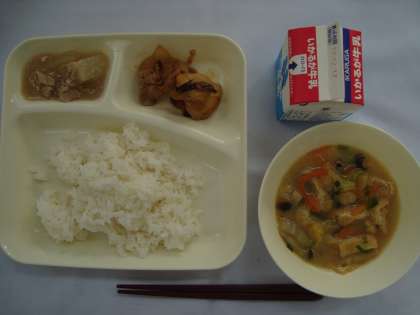 鶏肉の甘辛焼きは、鶏肉とたまねぎをタレに漬け、焼き物機(オーブンで)蒸し焼きにしています。甘辛いタレが児童のにあっていたのか、「先生、今日の肉おいしかった」という声を何人も聞きました。