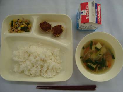 「あげシューマイ とうふのスープ ツナとチンゲンサイのいためもの ごはん 牛乳」