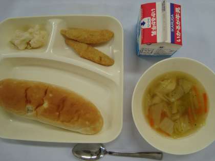 「わかさぎフライ はくさいのスープ カリフラワーのサラダ おさつパン 牛乳」