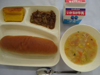 「牛肉のデミグラスソース煮 コーンスープ かぼちゃのプリン 黒糖パン 牛乳」