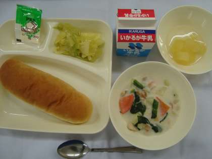 「ほうれんそうのクリームシチュー キャベツのサラダ 洋なし(缶) コッペパン ソフトマーガリン 牛乳」