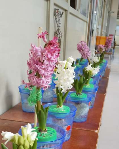 学校休業で、静かな校舎となっていますが、1年生教室前からは、ヒヤシンスのよい香りが漂ってきています。ピンクに続き、白の花が次々とつぼみがほころび始めました。子どもたちがいたら、きっと喜ぶだろうなあ。