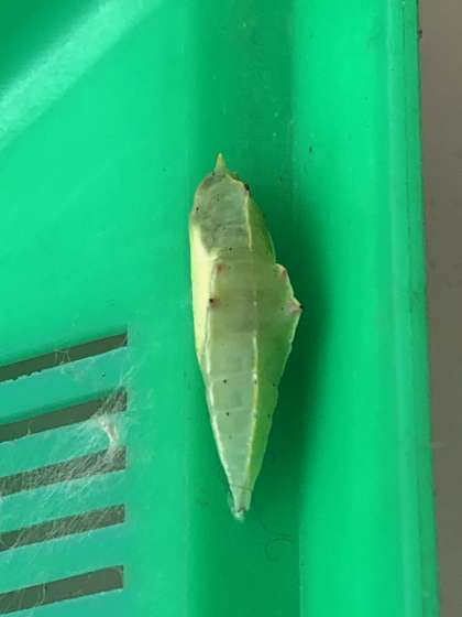 植物とともに,モンシロチョウとアゲハも育てています。モンシロチョウはすでに「さなぎ」に,アゲハは幼虫になっています。モンシロチョウは,キャベツや菜の花の葉で育ちます。アゲハはミカンの葉などで育ちます。同じチョウの仲間なのに,育つ環境がちがうのは何か不思議な感じですね。次の登校日にはモンシロチョウが虫かごの中を飛び回っているかもしれませんね。