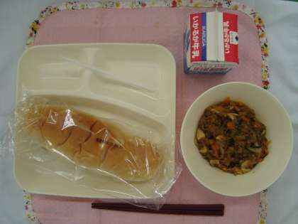「マーボーはるさめ、牛乳、おさつパン(さつまいも入りパン)」
