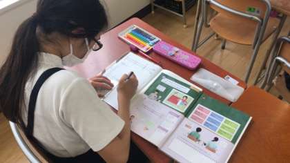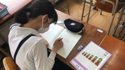 分数に整数をかける計算は、分母をそのままにして、分子にその整数をかけるのは、どうしてなのかを図や式、言葉で自分の考えをノートに書いていました。