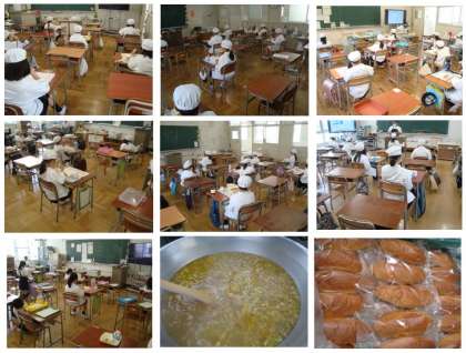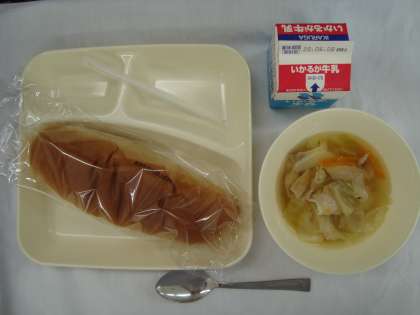 「豚肉とキャベツのスープ、黒糖パン、牛乳」
