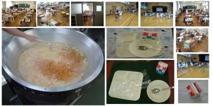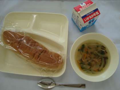 「ハムと野菜の中華スープ、黒糖パン、牛乳」