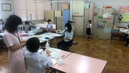 今日は、視力検査をしました。コロナウイルス感染拡大防止の観点から今回は、遮眼子(黒色で目を隠す器具)を使わずに、各自手を消毒して、消毒済みのガーゼを目に当てて視力検査をしました。