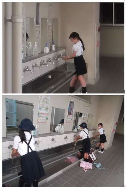 児童は、登校したら教室に入る前にきちんと手洗いをしています。
